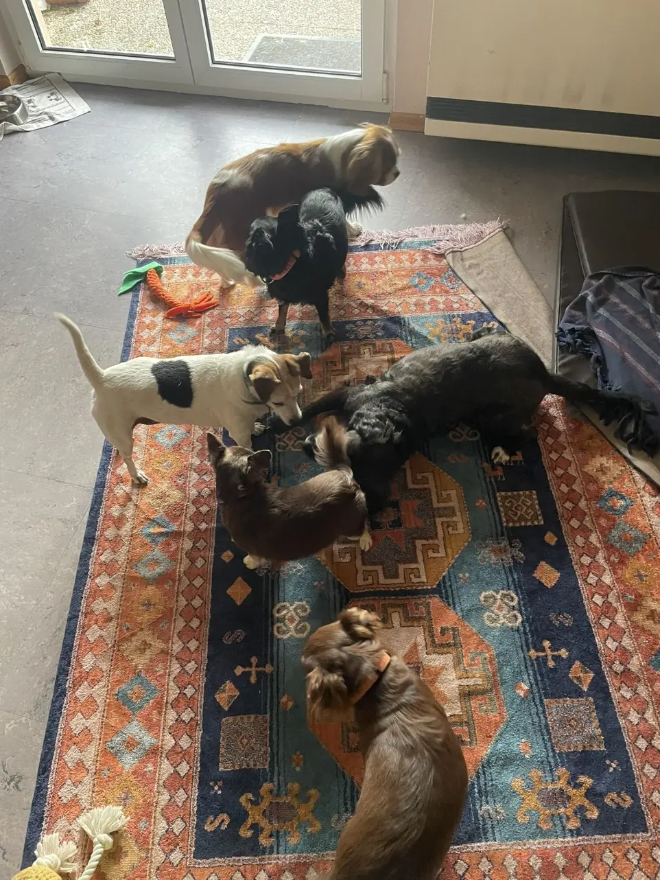 Les chiens évoluent en groupe librement dans l'appartement.